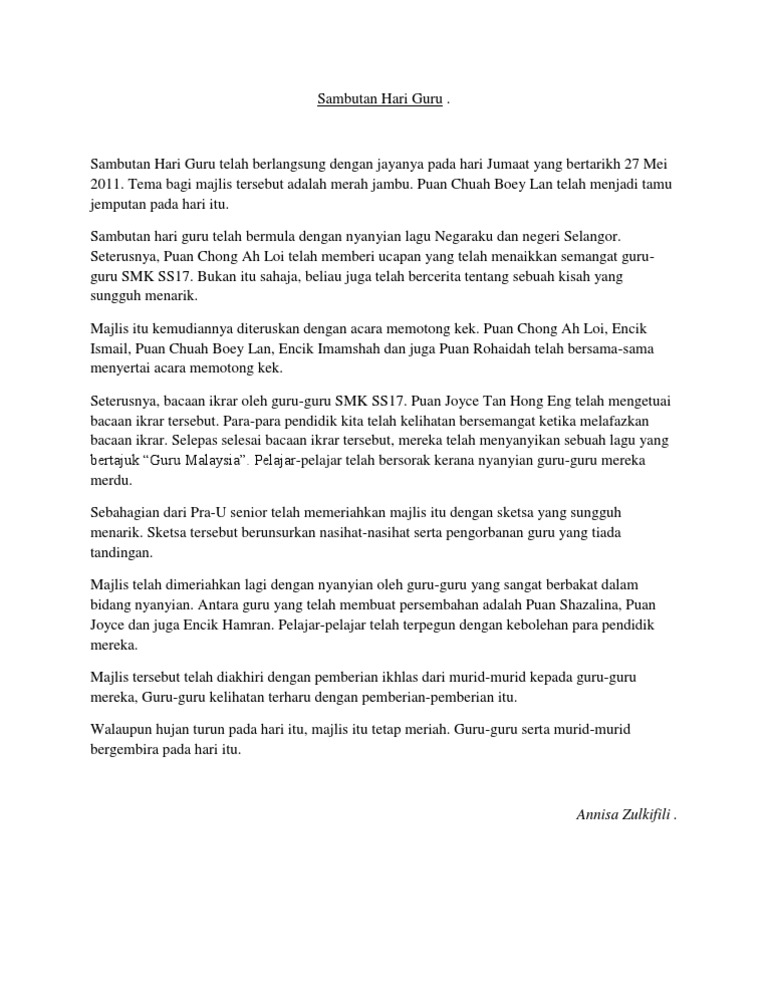 Saya sangat gembira apabila bangun pada awal pagi itu untuk meraikan bersama-sama rakan-rakan yang lain. Contoh karangan sambutan hari guru Pada 16 mei yang lalu sekolah saya iaitu Sekolah kebangsaan Ulu Yong Kapit telah mengadakan majlis sambutan Hari guru peringkat sekolah dengan meriah sekali. LAPORAN HARI GURU SEKOLAH JENIS KEBANGSAAN CINAPANDAN Pada 16 Mei 2013 SJK c Pandan telah mengadakan sambutan Hari Guru.